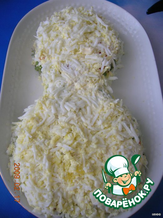 Укладываем на блюдо в форме "восьмёрочки", немного смазываем майонезом.