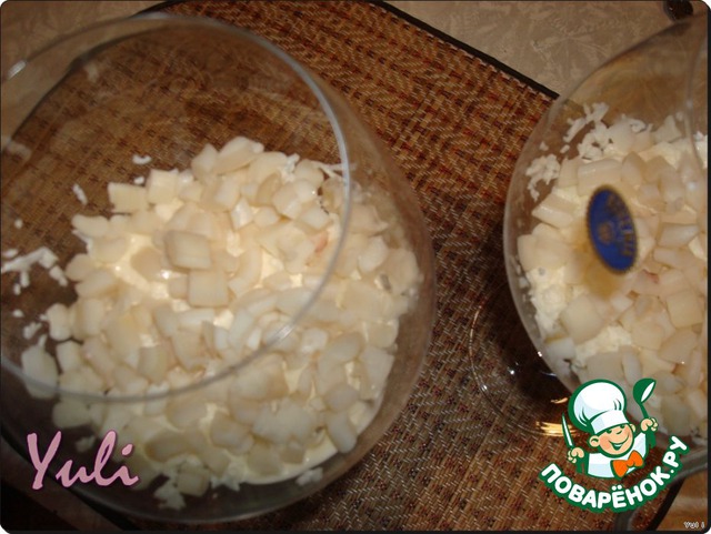 2 слой – мелко нарезанный кальмар, майонез
