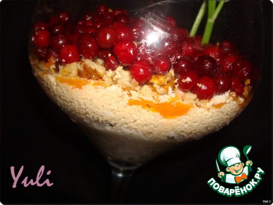 | Страсть - это эмоция сильная, стойкая, всеохватывающая... доминирующая над другими побуждениями человека... Вкусив хоть однажды сочетание кальмара с грецким орехом и брусникой, вы поймете, что этот салат стал навсегда предметом вашей страсти. К конкурсу "Scarlett к 8 Марта". |