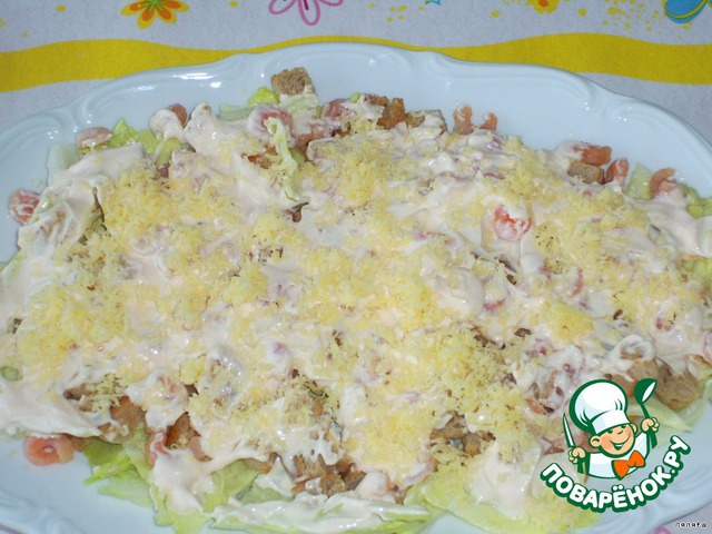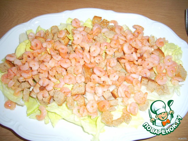 На листья салата выложить сухарики