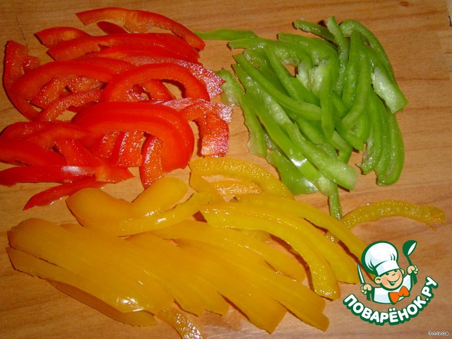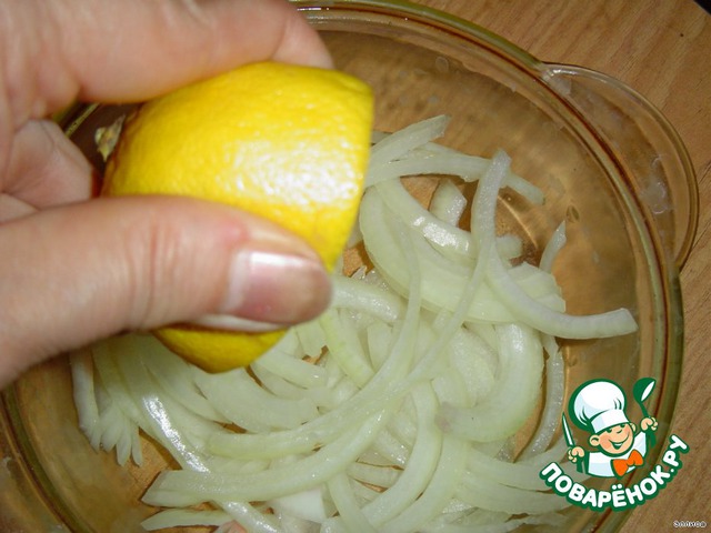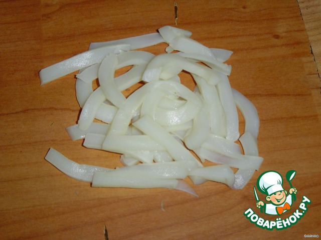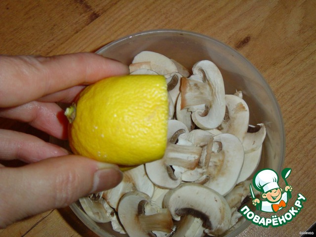 Нарезаем шампиньоны и лук, добавляем лимонный сок. Перемешиваем и оставляем мариноваться на 30 минут. Кальмары и сладкий перец нарезаем тонкой соломкой.