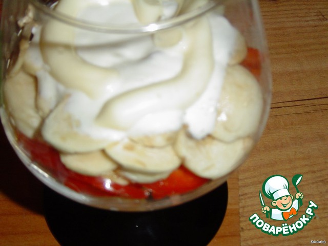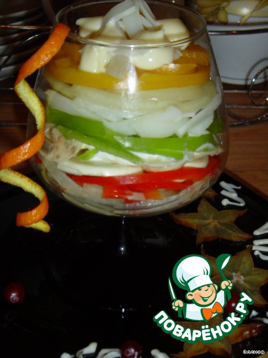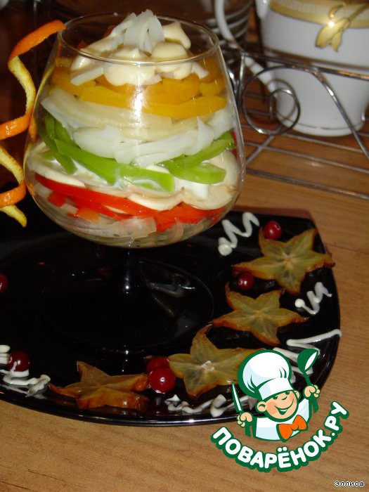 В бокал укладываем слоями кальмары, сладкий перец, лук и грибы. Смазываем слои смесью сметаны с майонезом.