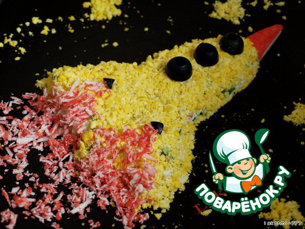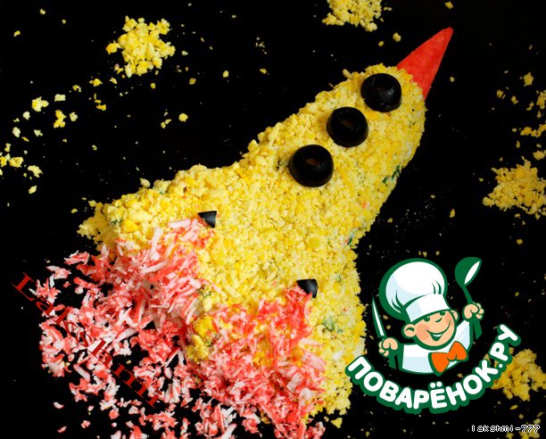 Выложить на тарелку в форме ракеты, посыпать желтком(частью). Из красной части крабовых палочек сделать огонь. Нос ракеты тоже сделать из крабовой палочки. Иллюминаторы из маслин.