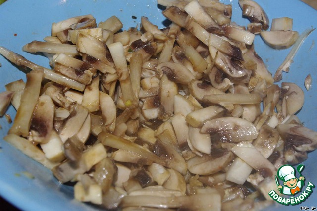 А в маринад от креветок помещаем нарезанные шампиньоны. Оставляем на 5 минут.