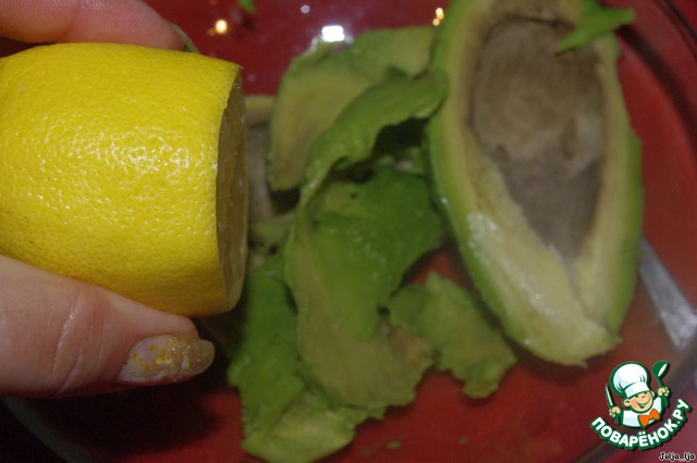 Для соуса - авокадо отделяем от кожицы и косточки, сбрызгиваем лимонным соком (оставшимся), измельчаем, как можно мельче (как плохо, когда блендер сломан, пришлось резать ножом, потом растирать вилкой. Завидую вам, счастливые обладатели несломанных блендеров!!!).