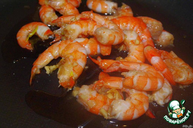 Теперь креветки (без маринада) выкладываем на разогретую сковороду, на которую добавить немного масла.
