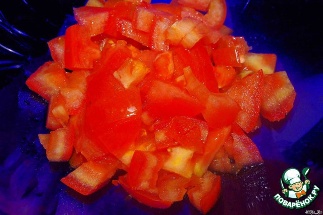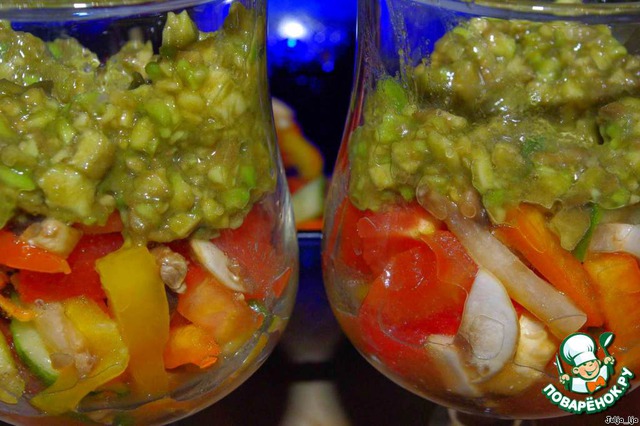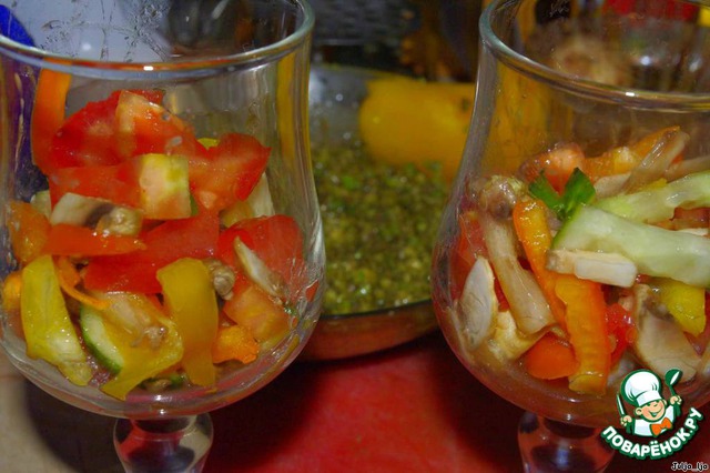 В бокал (стакан, креманку, на тарелку) выкладываем пару ложек овощной смеси.