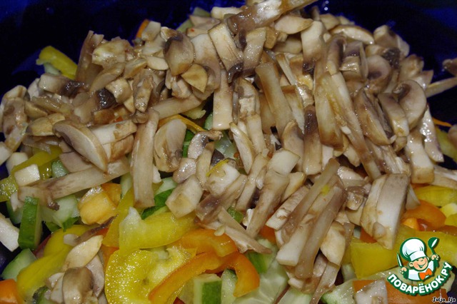 Шампиньоны вместе с маринадом отправляем к овощам. Перемешиваем и солим - по вкусу.
