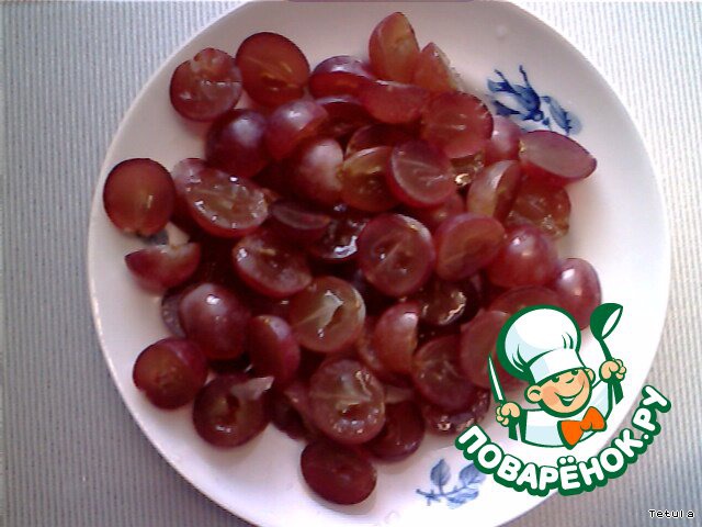 Виноград моем, отделяем ягоды, каждую разрезаем пополам, вынимаем косточки.