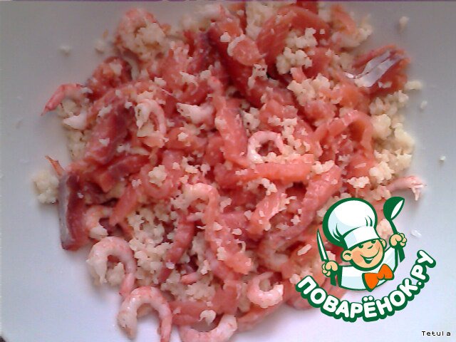 Семгу нарезаем тонкими ломтиками, из баночки с крилем сливаем воду, берем подготовленные креветки - все смешиваем.