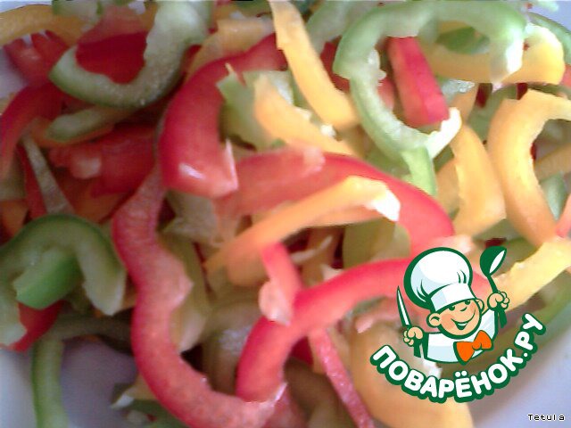 Сладкий перец моем, удаляем сердцевину и несочные перегородки. Оставляем немного средней части красного и желтого перца для украшения, а все остальное разрезаем вдоль на 4 части и нарезаем тонкими ломтиками.