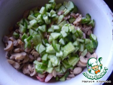 Выложить в миску кальмаров, креветки, консервированные шампиньоны.