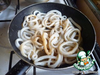 Тушки кальмаров нарезать тонкими кольцами, обжарить, добавив пару чайных ложечек жидкого дыма.