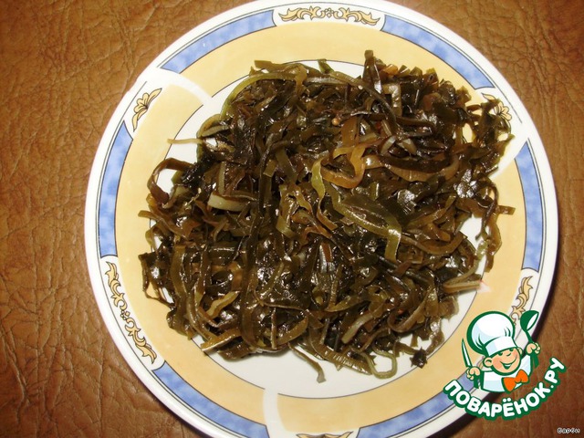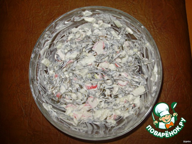 Морскую капустку, несмотря на то, что она продается уже готовой к употреблению, необходимо мелко нарезать. Если этого не сделать, то при перемешивании она "закублится", и салат невозможно будет перемешать.