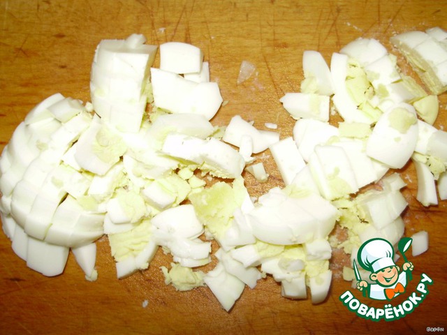 Крошим вареные яйца.