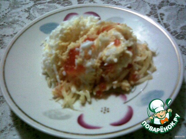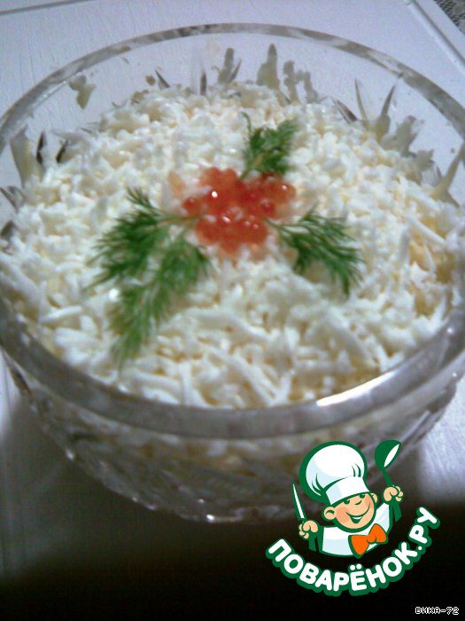 | Этот салатик родился на прошлый Новый год совершенно спонтанно. Я хотела назвать этот салат королевской мимозой, но муж сказал, что для этого в нем маловато икры... |