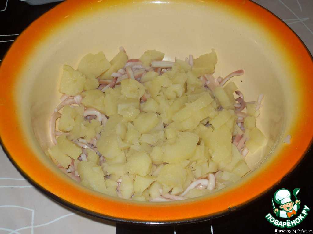 Кальмары отварить, остудить и нарезать соломкой (у меня были уже готовые).