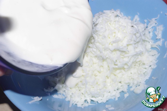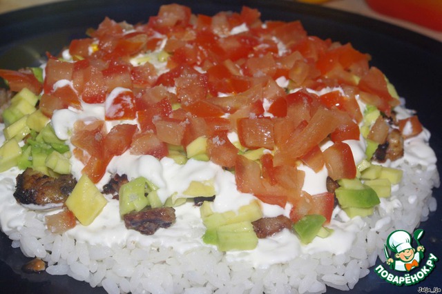 Выкладываем следующим слоем и хорошо поливаем заправкой.