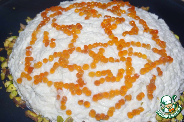 Выкладываем на салат. Точнее даже обмазываем массой салат со всех сторон. Бока посыпаем очищенными фисташками. Я их сильно не измельчала, просто слегка подавила ножом.
