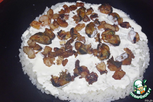 Выкладываем на рис морепродукты. У меня они были достаточно мелкие, поэтому я их не резала, если крупные, нарезать перед жаркой.