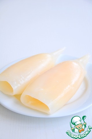 Кальмаров помыть, просушить. Снять пленку. Разрезать с одной стороны, распластать. Верхнюю часть тушки аккуратно нарезать острым ножом крестообразно, стараться не прорезать тушку насквозь. Это позволит не сворачиваться им во время приготовления.