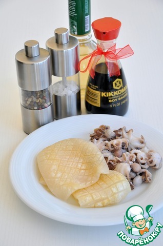 Готовых кальмаров нарезать соломкой. Морепродукты отставить в сторону.