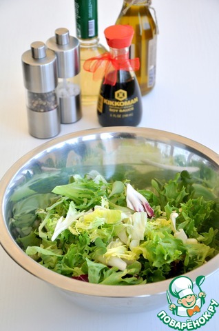 Салатные листья (у меня уже мытые) поместить в глубокую миску, полить заправкой, хорошо перемешать.