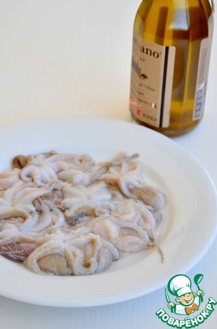 У беби-осьминогов вычистить "мешочки", хорошо помыть, обсушить бумажным полотенцем. На хорошо разогретой сковороде в малом количестве оливкового масла кратко обжарить осьминогов (по 1 минуте с обеих сторон).