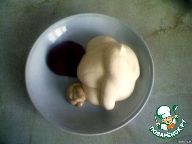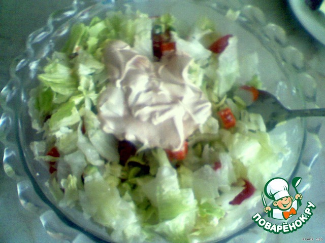 Соединить всё вместе, выложить в салатницу и полить майонезом.