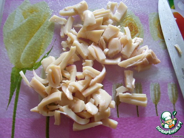 Сливаем из кальмаров жидкость и нарезаем соломкой.