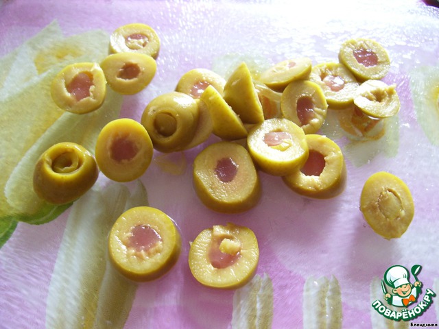 Оливки нарезаем колечками (у меня оливки с начинкой "омар")