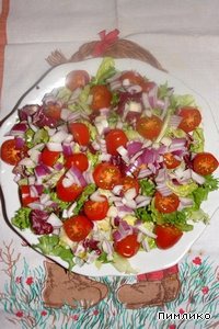 ...некрупно порезанный лук и половинки черри, сбрызгиваем слегка всю зелень оливковым маслом.