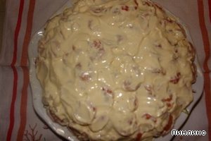Сверху смазываю тонким слоем заправки из оливкового майонеза на основе перепелиных яиц (можно легкий) плюс 1 ч. ложки горчицы или такого же количества равных долей майонеза, сметаны и классического кетчупа без добавок (поверьте, он не будет сухим и заправки надо совсем чуть-чуть).