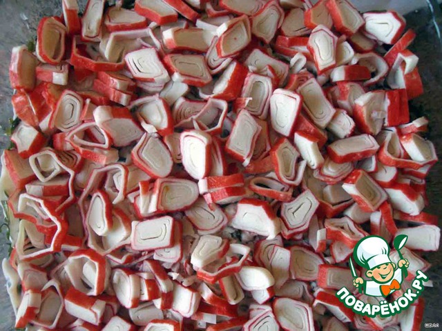 Седьмой - крабовые палочки. Их можно мелко порезать, можно - на терку. У меня они очень уж мило разворачивались, поэтому сделала так.