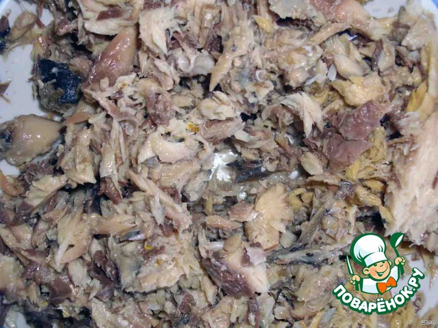 Третий - скумбрия (измельчаем ее вилочкой, масло от скумбрии не используем!).