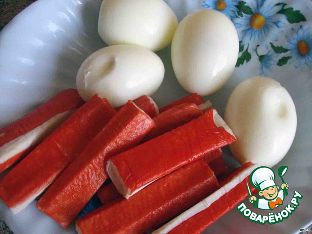 Отвариваем яйца, чистим. Крабовые палочки размораживаем, распаковываем.