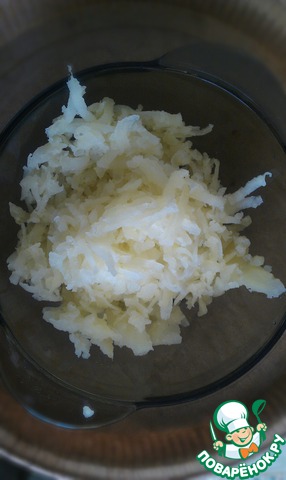Картофель отвариваем, удаляем кожуру, измельчаем. В нашем случае использовалась тёрка, получилось так.