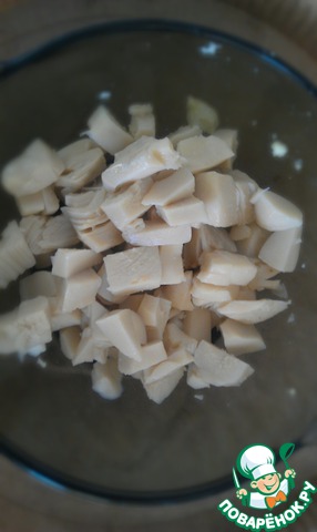 Пришло время кальмара. Мы использовали консервированный, мелко порезанный на квадратики.