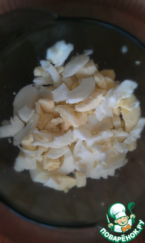 Следующим шагом берём предварительно отваренное и почищенное от скорлупы яйцо, мелко режем. У нас с помощью яйцерезки получилось вот это.