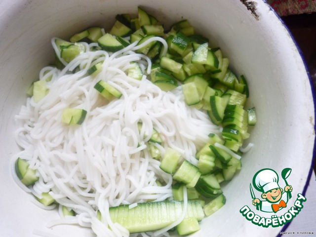 Огурец мелко нарезать, добавить к выложенной в миску готовой лапше