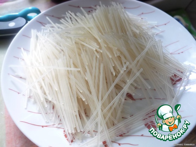 Рисовую лапшу (если она длинная, длину уменьшить) отварить в подсоленной воде 10 минут.