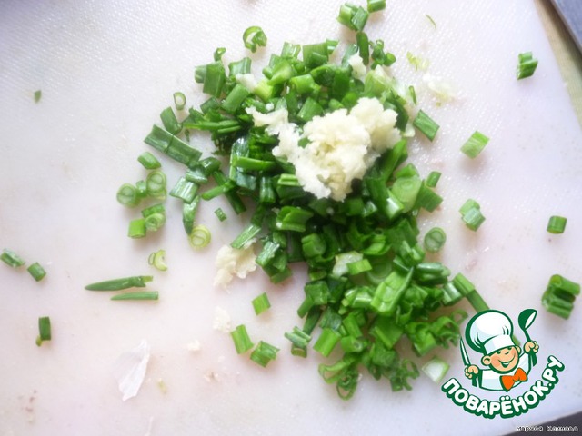 Зеленый лук мелко нарезать, чеснок пропустить через пресс, добавить к салату.