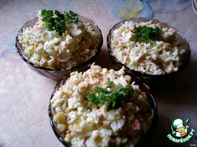 Яйца сварить, почистить, измельчить. Лук порезать мелко и замариновать (уксус+вода+сахар) на минут 20-30, чтобы была кислинка. Из консервированной кукурузы слить жидкость.