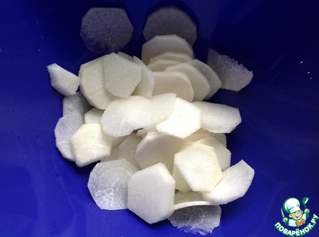 Дайкон очистить и нарезать очень тонкими кружочками. Подсолить и оставить на 10 мин, слегка перемешав