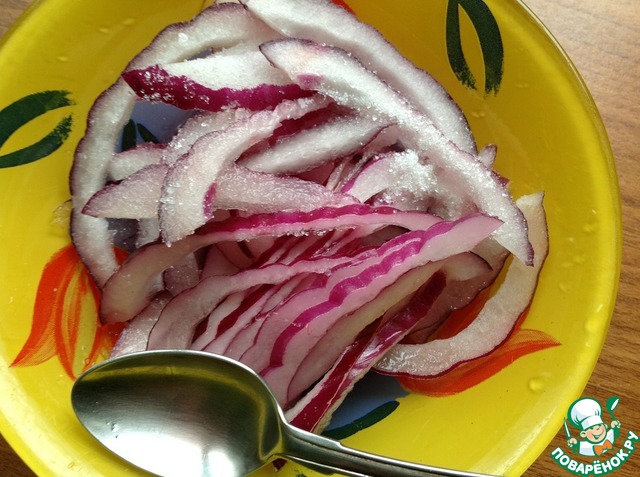 Лук нарезать полу кольцами. Добавить сахар и уксус. Немного перемешать и оставить на 5 мин