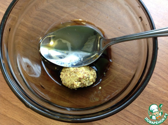 Сделать заправку: в чашке смешать соевый соус, масло и горчицу