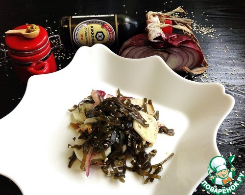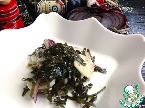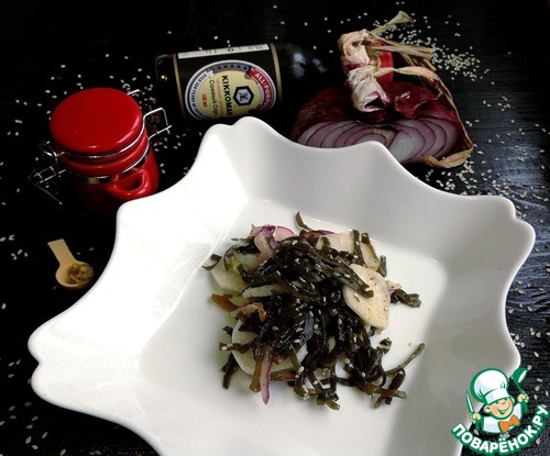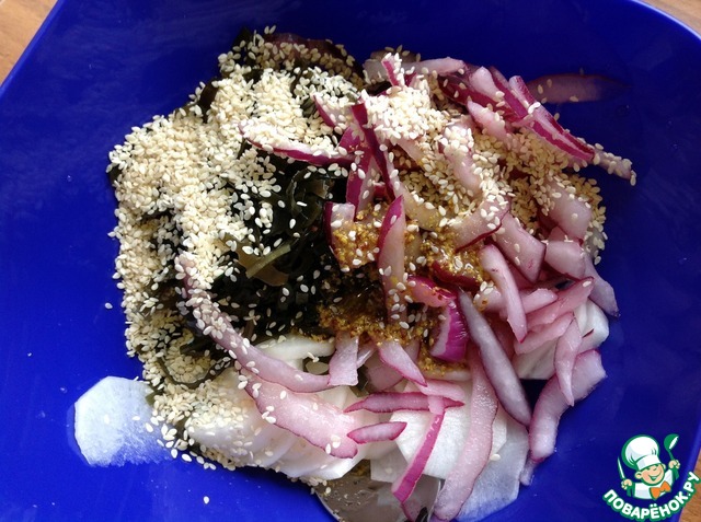 С дайкона слить выделившуюся жидкость. Добавить морскую капусту, кунжут, заправку. С лука слить маринад и добавить лук к салату. Перемешать, и дать постоять минут 30.