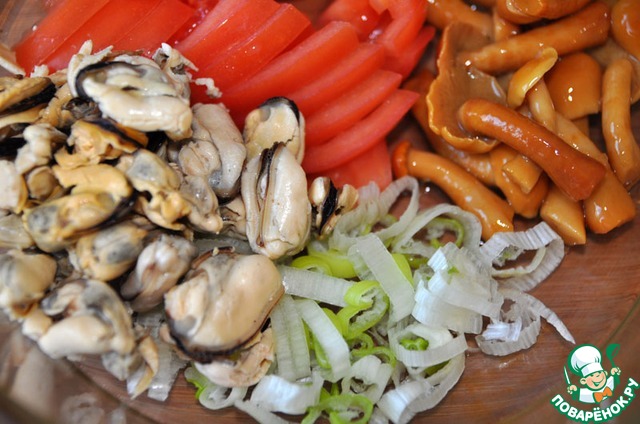 Смешиваем отваренные мидии, нарезанные лук и помидор. Добавляем отваренные грибы, у меня опята, можно брать любые.