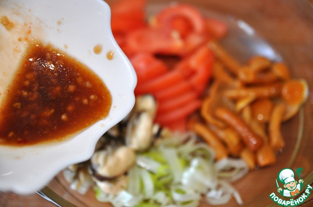 Выливаем заправку в мидии с овощами и грибами, перемешиваем.