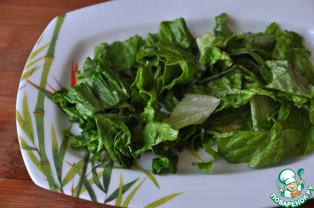 На сервировочную тарелку кладём листья салата (порванные) или салатный микс.